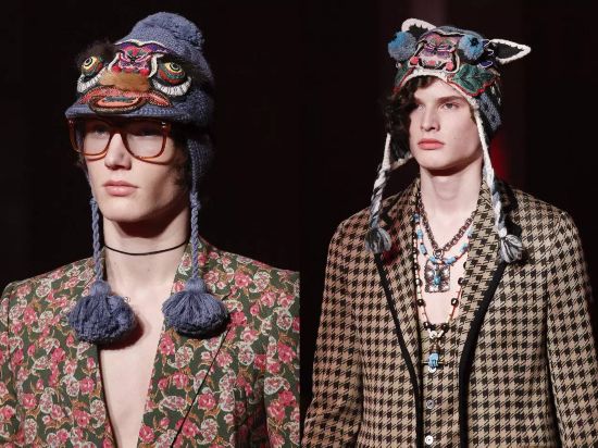 這種帶有兩個燈籠穗的毛線遮耳帽,來自於安第斯山脈上的秘魯高地民族的傳統御寒帽子。花色鮮艷多彩,幾何圖案抑或彩虹橫條,給在寒冷單調高原山地上生活的人們裝點上自然和諧的絢麗色彩,有種樂天派的精神。Alessandro Michele 讓男孩們戴上毛線帽,並在上面加上了老北京傳統的布老虎針織圖案,油紙風箏似的裝飾,南北半球傳統元素的碰撞,似乎回到了童年,恣意玩樂。