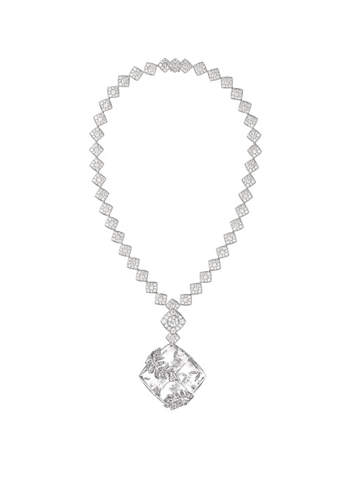 菱形圖案別具一格,鑲嵌鑽石的輪廓格外精巧雅致。天藍寶石和海藍寶石錦上添花,與白金和鑽石的耀眼光輝形成視覺對比,瑰麗閃爍。珍珠、細工鑲嵌的灰色珍珠母貝,以及水晶各具風華綺麗,但異曲同工又襯托出這一系列的精髓。