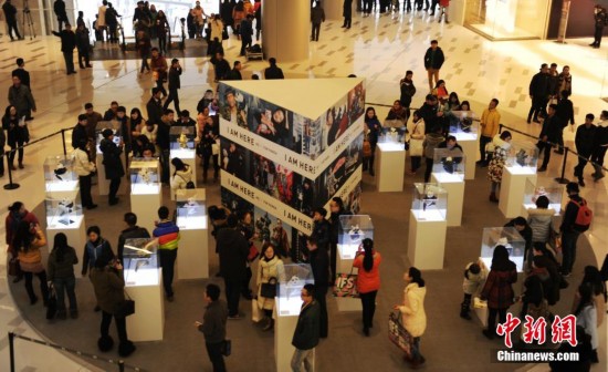 1月14日,为唤起公众对熊猫保护工作的关注与支持,成都IFS特别邀请Lawrence设计制作了高40公分的白色熊猫雕塑,并由香港著名策展机构邀请张曼玉、杜鹃、黄晓明、周迅、郭富城、郑洁、刘嘉玲等20位知名巨星及潮流领袖各自设计独一无二的熊猫雕塑,并在成都IFS现场举办熊猫慈善展览。据悉,这20只熊猫雕塑随后将在成都IFS举行公开慈善拍卖,筹得的全部善款将支持中国保护大熊猫研究中心即将成立的都江堰大熊猫疾控中心。图为漂亮的“土豪”熊猫吸引民众。中新社发 刘忠俊 摄