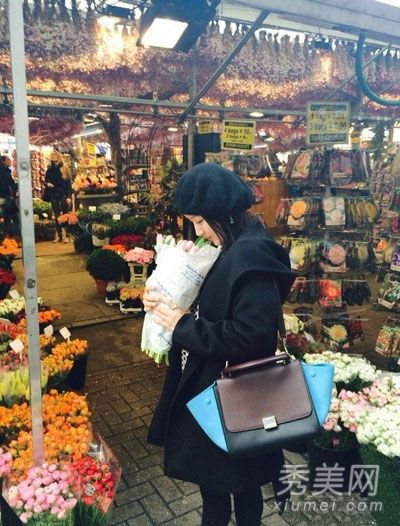 在花店挑选花,看起来好浪漫唯美。穿着黑色连帽大衣搭配波点打底衫,下穿黑色丝袜,戴着复古礼帽,格外优雅动人。