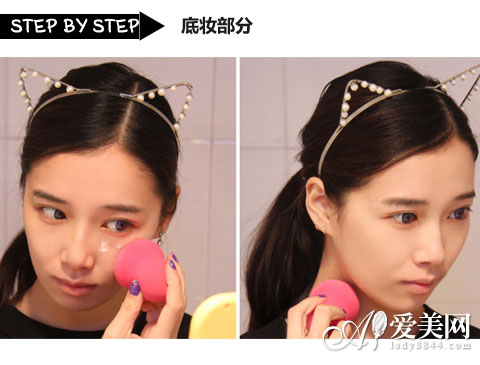 把BB霜点在额头、笔尖、脸颊、下巴,记得要少量多次,底妆清透很重要。用小葫芦把CC霜匀开,先点后按压的方式,葫芦尖尖的部分用在鼻翼两侧和一些细节上按压推匀,脖子部分不要忽略哦。最后用蜜粉定妆。