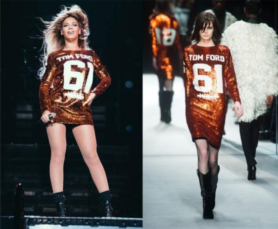 Beyonce在早前的演唱会上,身穿Tom Ford 2014秋冬系列亮片连衣裙,橙色亮片格外高调夺目,加上运动风格的元素又凸显无限的活力。